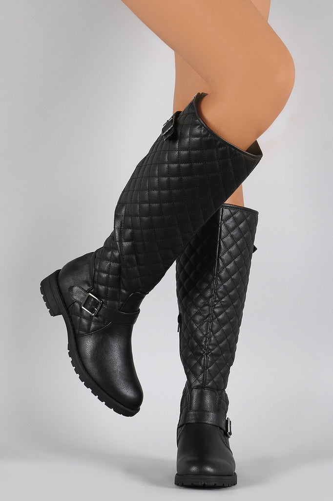 Description These knee high boots features a quilted design shaft with decorative buckle strap detail, back zipper trim, round toe silhouette, and low block heel. Finished with cushioned insole, soft interior lining, and full-length side zipper closure for easy on/off.
