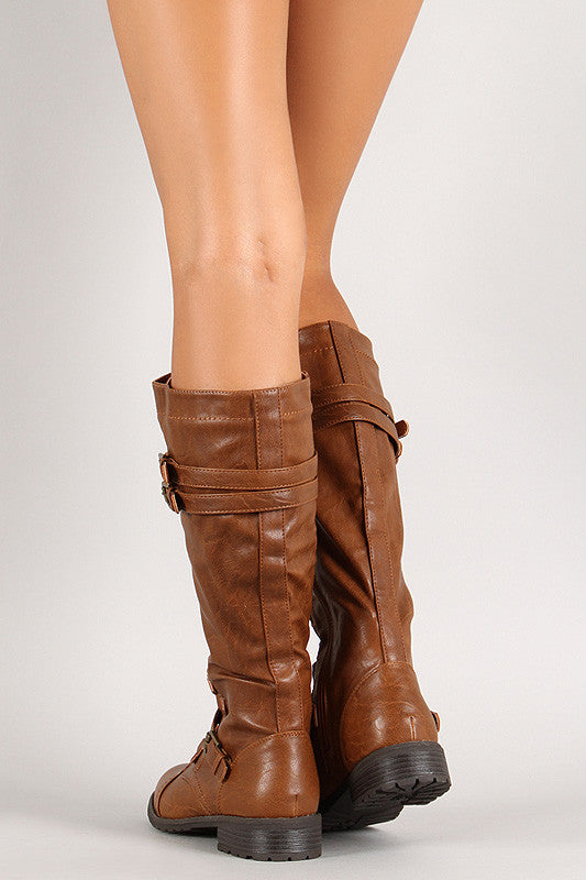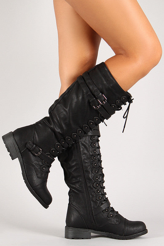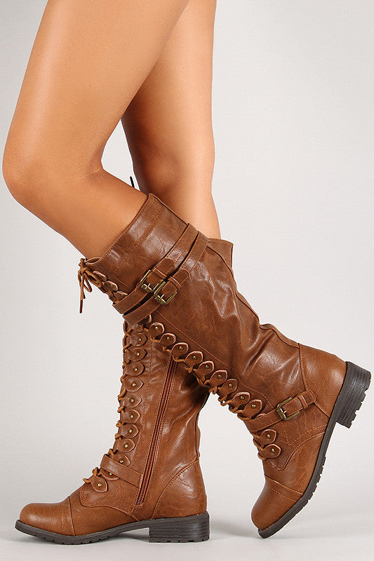 Featuring vegan leather upper, round toe, lace up front, three buckle straps, chunky flat heel, side zipper closure, stitching detail, and finished with lightly padded insole.
