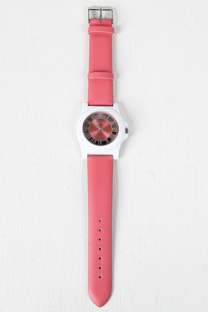This unique watch features a partially transparent face with Roman numeral hour markings, matte bezel, and leatherette straps. Finished with two keepers and adjustable buckle closure.