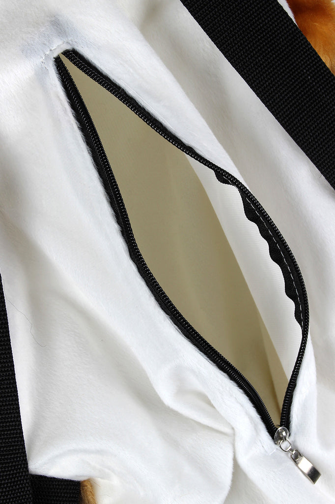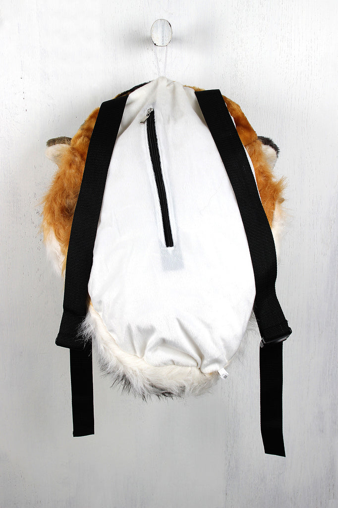 This fierce backpack features a large, faux fur tiger head design, adjustable webbed straps with side release buckles, and a spacious zippered compartment. Straps have a 14" drop.